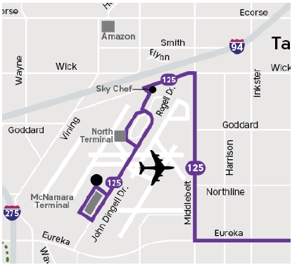 - Travels Eureka to Middlebelt to the Goddard Extension and enters/exits the airport at Sky Chef